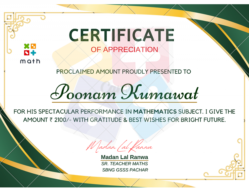 पूनम कुमावत बोर्ड परीक्षा कक्षा 10 में गणित में 100/100 अंक लेन पर 2100/- रूपये का नगद पुरस्कार